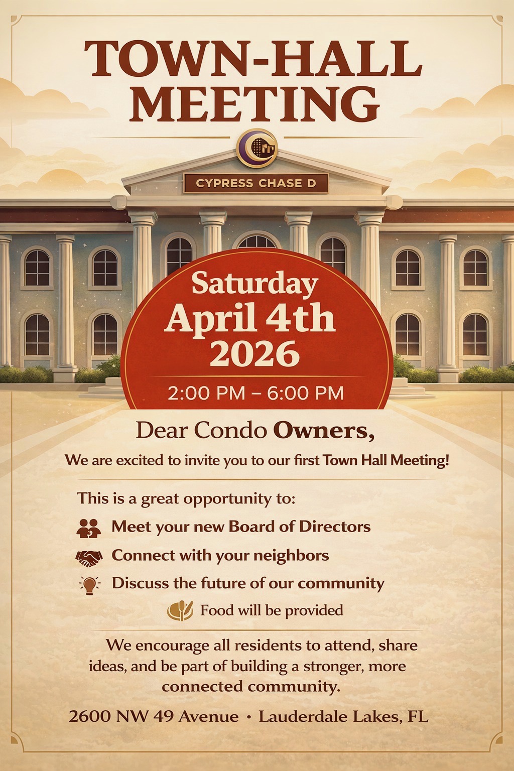 TOWN-HALL MEETING ITOps2026-04-04T03:09:51+00:00April 3rd, 2026|From the President, Notices| Share This Article FacebookXLinkedInWhatsAppTumblrPinterestEmail Related Posts REMINDER ELECTION 2026 REMINDER ELECTION 2026 March 19th, 2026 | 0 Comments LIVE TV OPTIONS FOR CONDO RESIDENTS WITH FIBER OPTIC INTERNET LIVE TV OPTIONS FOR CONDO RESIDENTS WITH FIBER OPTIC INTERNET March 4th, 2026 | 0 Comments FASTSTREAM – Fiber Optic Internet Guide and Troubleshooting FASTSTREAM – Fiber Optic Internet Guide and Troubleshooting February 26th, 2026 | 0 Comments BOARD OF DIRECTORS MEETING | January 26th, 2026 11am BOARD OF DIRECTORS MEETING | January 26th, 2026 11am January 14th, 2026 | 0 Comments Wishing you a Happy New Year 2026 | Office will be closed Wishing you a Happy New Year 2026 | Office will be closed January 1st, 2026 | 0 Comments Condo Craze and HOAs Condo Craze and HOAs December 24th, 2025 | 0 Comments Town-Hall Meeting Town-Hall Meeting December 3rd, 2025 | 0 Comments THANKSGIVING LUNCHEON THANKSGIVING LUNCHEON November 25th, 2025 | 0 Comments