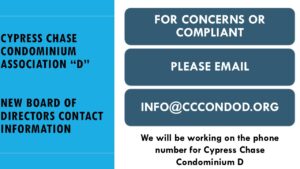 NEW BOARD OF DIRECTORS INFORMATION NEW BOARD OF DIRECTORS INFORMATION Cypress Chase Condo D2026-04-13T18:27:02+00:00April 13th, 2026|From the President| Share This Article FacebookXLinkedInWhatsAppTumblrPinterestEmail Related Posts Town Hall Meet April 18th, 2026 Town Hall Meet April 18th, 2026 April 13th, 2026 | 0 Comments TOWN-HALL MEETING TOWN-HALL MEETING April 3rd, 2026 | 0 Comments REMINDER ELECTION 2026 REMINDER ELECTION 2026 March 19th, 2026 | 0 Comments LIVE TV OPTIONS FOR CONDO RESIDENTS WITH FIBER OPTIC INTERNET LIVE TV OPTIONS FOR CONDO RESIDENTS WITH FIBER OPTIC INTERNET March 4th, 2026 | 0 Comments FASTSTREAM – Fiber Optic Internet Guide and Troubleshooting FASTSTREAM – Fiber Optic Internet Guide and Troubleshooting February 26th, 2026 | 0 Comments BOARD OF DIRECTORS MEETING | January 26th, 2026 11am BOARD OF DIRECTORS MEETING | January 26th, 2026 11am January 14th, 2026 | 0 Comments Condo Craze and HOAs Condo Craze and HOAs December 24th, 2025 | 0 Comments Town-Hall Meeting Town-Hall Meeting December 3rd, 2025 | 0 Comments