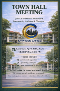 TOWN HALL MEETING APRIL 25TH, 2026 @ 12PM TOWN HALL MEETING APRIL 25TH, 2026 @ 12PM Cypress Chase Condo D2026-04-13T22:02:47+00:00April 13th, 2026|From the President| Share This Article FacebookXLinkedInWhatsAppTumblrPinterestEmail Related Posts BOARD OF DIRECTORS MEETING APRIL 16TH 2026 @ 12 PM BOARD OF DIRECTORS MEETING APRIL 16TH 2026 @ 12 PM April 14th, 2026 | 0 Comments NEW BOARD OF DIRECTORS INFORMATION NEW BOARD OF DIRECTORS INFORMATION April 13th, 2026 | 0 Comments TOWN-HALL MEETING TOWN-HALL MEETING April 3rd, 2026 | 0 Comments REMINDER ELECTION 2026 REMINDER ELECTION 2026 March 19th, 2026 | 0 Comments LIVE TV OPTIONS FOR CONDO RESIDENTS WITH FIBER OPTIC INTERNET LIVE TV OPTIONS FOR CONDO RESIDENTS WITH FIBER OPTIC INTERNET March 4th, 2026 | 0 Comments FASTSTREAM – Fiber Optic Internet Guide and Troubleshooting FASTSTREAM – Fiber Optic Internet Guide and Troubleshooting February 26th, 2026 | 0 Comments BOARD OF DIRECTORS MEETING | January 26th, 2026 11am BOARD OF DIRECTORS MEETING | January 26th, 2026 11am January 14th, 2026 | 0 Comments Condo Craze and HOAs Condo Craze and HOAs December 24th, 2025 | 0 Comments